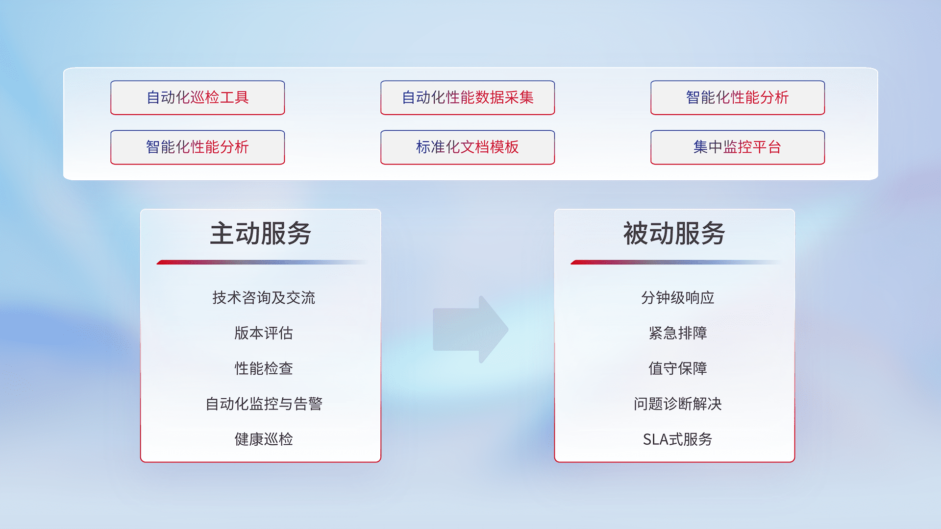 智能化工具和标准化文档,,,,保障服务质量,,,提供主动服务(包含技术咨询、、、版本评估、、、性能检查、、自动化监控与告警、、、、健康巡检)和被动服务包含(分钟级响应、、紧急排障、、、值守保障、、问题诊断解决、、、、SLA服务)。。