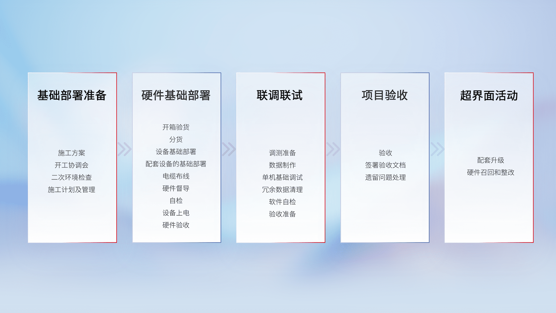 从基础部署准备、、、、硬件基础部署、、联调联试、、项目验收、、、越界面活动的全过程可追溯,,,,保证施工质量和进度。。。。